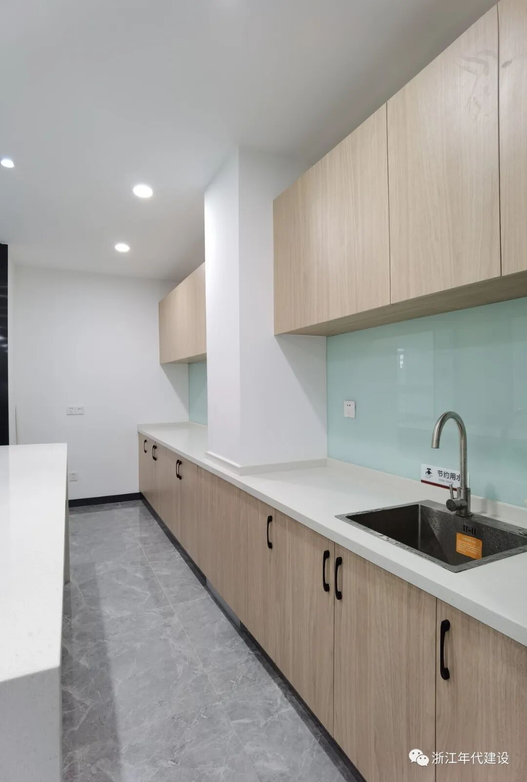 公共走廊及茶水区是继电梯厅外又一个主要共享空间,它采用同大厅及其它公共空间风格相同的格调,地面采用地砖,墙面局部木饰面装饰结合办公玻 璃隔断,通过玻璃引入室外光线,吊顶石膏板及灯槽,营造明亮通透的效果。各层走廊动线布局合理、顺畅,色调上用简洁素雅的中明度色调为主,配以绿色植物点缀,使整个室内统一而富有变化,给人一种清新、舒适的感觉。